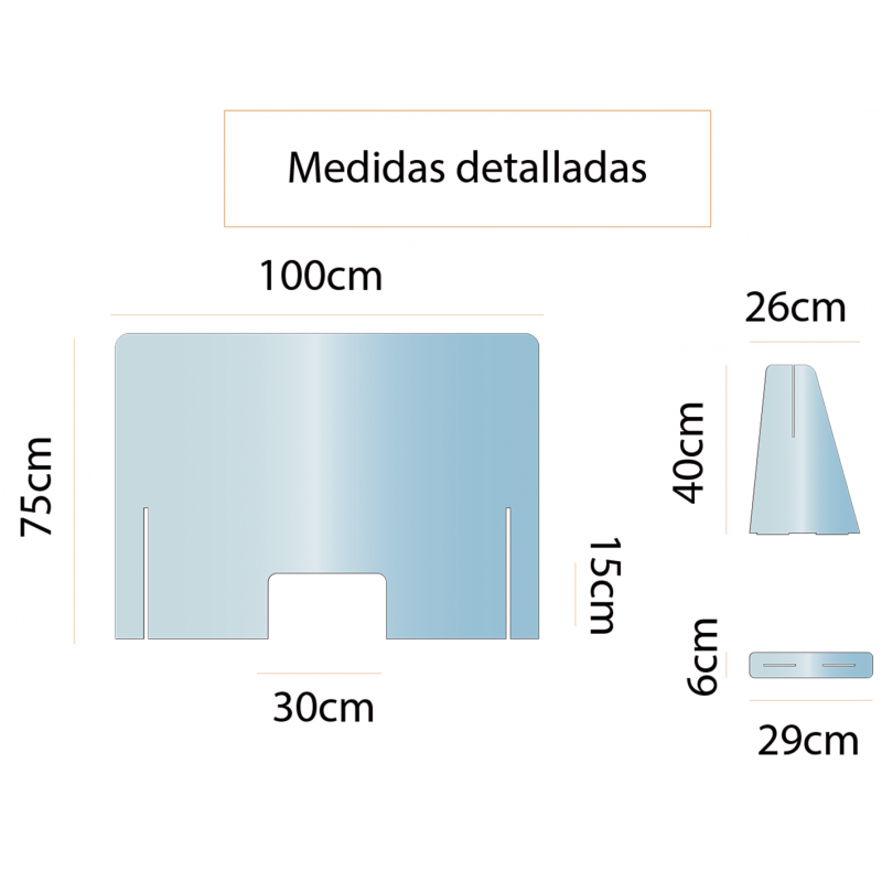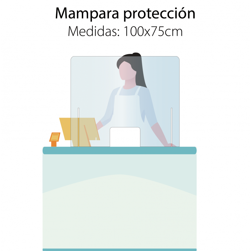 Mampara de protección fabricada en metacrilato transparente de 2mm. Ideal para separar cliente y dependiente, reduciendo así las posibilidad de contagios.